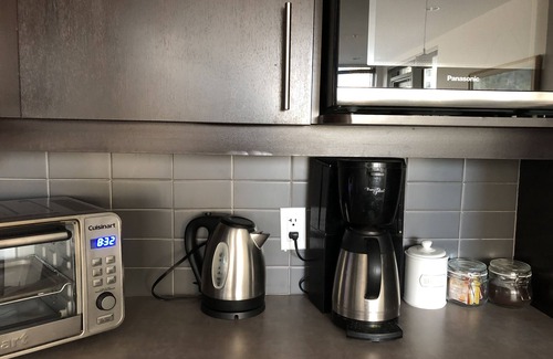 There are two separate bedrooms - one with ensuite bathroom (tub/shower) and own TV, and the other with bathroom (shower) just outside the room. Fans are available in each bedroom, which have room-darkening shades to ensure a restful sleep. The kitchen is fully equipped with stainless steel appliances, Denby china, kettle and coffee maker ready for you to enjoy morning coffee or tea on the balcony or at the bar perched on one of the four stools around the counter.
