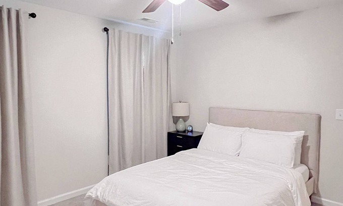 Your home away from home in Fayetteville with 1 bedroom and 1 bathroom. This brilliant unit offers a cozy living room with a sofa bed, perfect for relaxing after a day of exploring. Guests can enjoy the pleasant bedroom and modern amenities like heating, iron, and AC. Guests need not worry about packing soaps, linens, towels or even laundry detergent! A complimentary supply will be provided! We look forward to welcoming you.