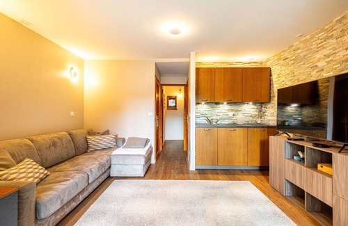 The living room features a convertible sofa bed where you can relax, a wide-screen TV to watch all your favourite shows and a dining table. The area is warm and has a lot of natural sunlight that brightens the space, making it even more inviting.