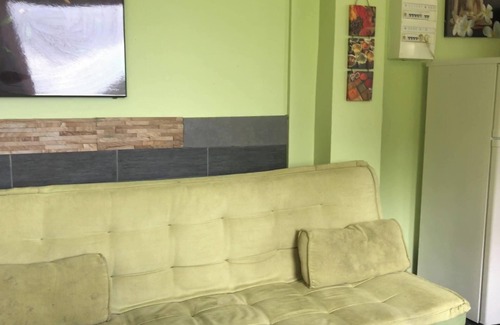 The apartment boasts a bright and inviting living area with air conditioning and modern amenities. With a sofa area, dining space, and a fully equipped kitchen, it's a comfortable place to spend time together.