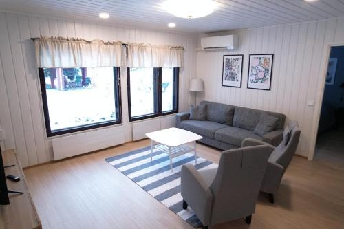 Providing a garden, Kolmen makuuhuoneen talo - Oma sauna provides accommodations in Korholanmäki. This property offers access to a terrace, free private parking, and free Wifi. The apartment has an outdoor fireplace and a sauna. The air-conditioned apartment consists of 3 bedrooms, a living room, a fully equipped kitchen with a dishwasher and a coffee machine, and 1 bathroom with a shower and a hair dryer. A flat-screen TV is provided. The accommodation has a fireplace. Kajaani Train Station is 9.1 miles from the apartment, while SuperPark Vuokatti is 13 miles away. Kajaani Airport is 14 miles from the property.