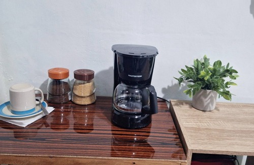 For your convenience, there's an electric kettle and a microwave. Bathroom amenities include a hair dryer, towels, and toilet paper.