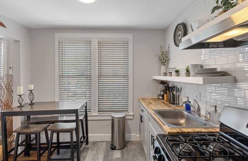 The unit is fully self-check in and checkout with security code access, and includes one reserved parking space at the rear of the building. Access to the unit is via a secured entrance on the west side of the building. This is a shared building with other short-term and long-term tenants. The eatery below is opened daily from 8am to 8pm, so you may hear an occasional blender.