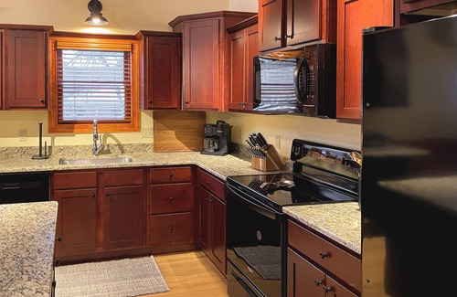 The raised, covered deck, nestled among the trees, features a Weber-Genesis grill, picnic tables, and lounge seating, offering the perfect spot to unwind while immersed in the sights and sounds of the surrounding wildlife and forest canopy. Our lower front patio has several adirondack seating for lounging after a long day at the lake or exploring the local mountainscapes. On the back lower patio, a private 6-person hot tub offers a peaceful retreat accommodating up to 6-8.