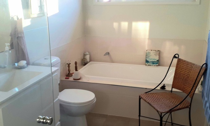 The house is close to Byron Bay, New Brighton and South Golden beaches. Also many National parks for bush walks. In walking distance to restaurants cafes and great shops. The room is light filled and you have your own bathroom with a bathtub.