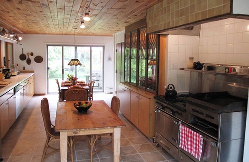 The first floor of the home has a large chef's eat in kitchen, fully equipped with a 6 burner Garland stove, appliances (waffle maker, panini press, blender, Cuisinart, coffeemaker, etc.) and table and cookware galore. A large outdoor gas grill off the kitchen makes cookouts a breeze, and you can enjoy your meals in the kitchen, on one of 2 outdoor dining tables, or at the formal dining room table which seats 8. Help yourself to herbs from the small garden just steps from the kitchen.