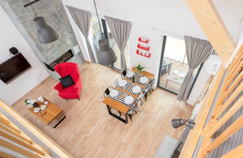 This fully equipped apartment with a mezzanine can accommodate up to 7 people, making it an ideal option for guests traveling with a group of friends or for large families. The apartment is located on the 1st floor and consists of a spacious living room with a sofa bed, a bedroom, a bathroom with a shower, and a fully equipped kitchenette (dishwasher, oven with microwave function, induction hob, fridge-freezer, coffee maker, blender, toaster, kettle, dishes). The separate bedroom is equipped with a double bed and a large closet. Additionally, there are three beds on the mezzanine. Guests also have access to a TV and free Wi-Fi network, as well as all necessary bathroom amenities (hair dryer, ironing facilities). Thanks to the air conditioning, guests can adjust the temperature indoors, making your stay in this apartment an unforgettable experience all year round, regardless of the weather. The view from the balcony will allow you to feel the true mountain atmosphere - you can enjoy a beautiful view of the picturesque panorama. The sunny terrace is perfect for relaxing, no matter the season. The windows also have external blinds. The apartment offers private, covered parking spaces. Guests also have the opportunity (upon prior reservation) to use the free wellness area available on the premises.
