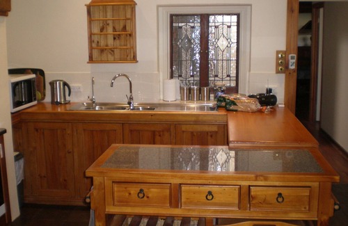The kitchen has a double bowl sink, under bench oven and separate 4 burner cook top. There is plenty of bench space and we have provided our guests with a 500 litre refrigerator. The dining table seats 8 guests. There are polished wood floors and slate throughout the home.