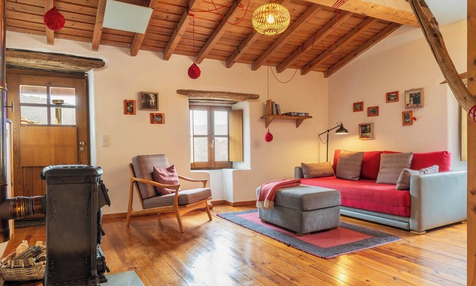 On the upper floor, there is a double bedroom with the possibility of joining the beds and a spacious nest-shaped bed for the little ones. It has a large and cozy living space with a wood burner, an armchair, and a comfortable sofa bed.