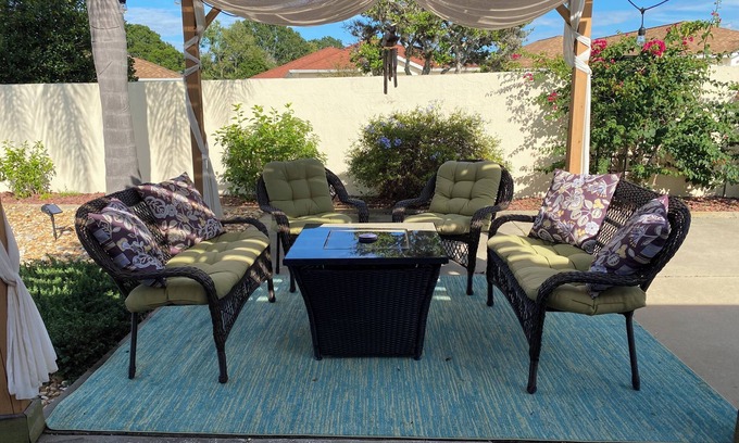 Fantastic location between Spanish Springs and Sumter Landing, each approx. a 10 minute fun golf cart ride away (yes, golf cart included). The Rio Grande family pool is right at the beginning of this quiet neighborhood. Chula Vista recreation center is a 3-min ride up the street for all your activities, also where the adult pool is.